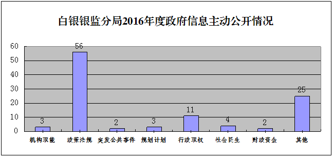 2016年,白银银监分局紧密结合辖区银行业监督管理工作实际,严格按照《中华人民共和国政府信息公开条例》(以下简称《条例》)的要求,以落实《中国银监会办公厅关于印发2016年政务公开工作要点的通知》(以下简称《要点》)为重点,不断完善政务信息公开工作机制,全面、及时、准确公开政府信息,有效提高了工作透明度。 一、概述 2016年,白银银监分局根据《条例》、银监会办公厅、省政府办公厅《2016年政府信息公开工作要点》及白银市政府办公室《关于全面推进政务公开工作的实施意见》要求,以打造服务型机关为出发点,以推进“三个清单一张网”建设为抓手,立足全市银行业监督管理工作实际,进一步深化政务公开,推进政务服务规范化建设,取得了明显效果。一是严格按照白银市政府信息公开统计制度的有关要求,确定专人做好政府信息公开数据的统计工作,按时上报月度政府信息公开数据。二是认真编制《白银银监分局政府信息公开目录》,按季上报市政府信息公开办公室审核。三是积极向社会公开分局监管职责和范围,进一步强化了社会公众对分局的认知度。四是积极向社会公开监督渠道,公布投诉电话,并督促指导辖区银行业金融机构向金融消费者公开岗位职责、服务承诺、收费项目、监督渠道等,切实保护金融消费者的合法权益。 二、政府信息主动公开情况 (一)公开类别。2016年末,分局主动公开政府信息公开事项8类106项,其中机构职能3项,政策法规56项,突发公共事件2项,规划计划3项,行政职权11项,社会民生4项,财政资金2项,其他25项。