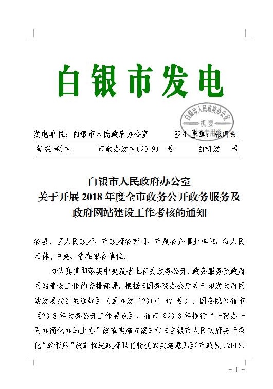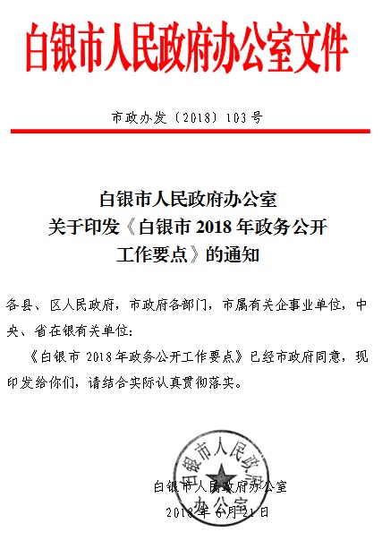 本报告根据《中华人民共和国政府信息公开条例》(以下简称《条例》)要求编制而成。全文包括概述,主动公开政府信息情况,政府信息依申请公开办理情况,政府信息公开收费及减免情况,因政府信息公开申请行政复议、提起行政诉讼的情况,政府信息公开工作机构、人员、经费的情况,政府信息公开工作存在的主要问题及改进措施。报告中所列数据的统计时限为至止。本报告通过白银市人民政府门户网站 、市档案馆、图书馆等政府信息公开公共查阅场所公布。如对本报告有任何疑问、意见,请与白银市人民政府办公室联系(联系电话:0943—8253879,传真:0943—8253879,电子邮箱byszwgk@163.com)。 一、概述 2018年,我市政府信息与公开工作坚持以习近平新时代中国特色社会主义思想为指导,紧盯市委、市政府中心工作和社会关切,严格贯彻落实《条例》及省上年度《工作要点》和省政府办公厅《关于做好政府信息公开统计报送工作的通知》等相关文件要求,加强领导,明确责任,细化任务,强化督导,协同推进组织建设、平台建设、制度建设,全市政府信息公开工作的主动性不断增强,工作质量效益进一步提高,政府信息公开的广度、深度有效提升,政府工作透明度更加明晰,有效地保障了公民的知情权,为全市经济社会发展营造良好的环境。 (一)加强组织领导。