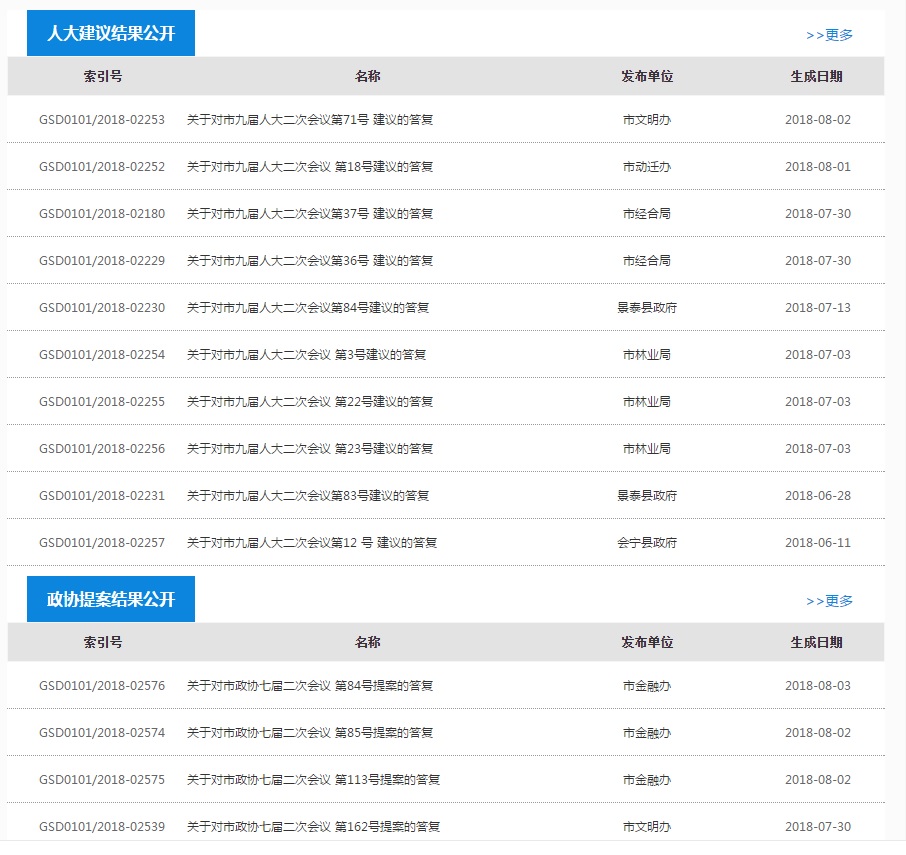 按照《关于认真做好2018年市“两会”建议提案办理工作的通知》要求,主动公开建议提案办理答复结果,接受群众监督。全年公开人大建议办理结果90件,政协委员提案办理结果172件。 (六)重点领域信息公开情况。一是细化重点领域政府信息公开目录。对市政府门户网站重点领域政府信息公开目录进行优化调整,规范重点领域信息目录。二是推进市场准入负面清单信息公开。制定下发《白银市全面推行“双随机、一公开”监管工作实施方案》,开展“双随机”抽查;依托全国企业信用信息公示系统(甘肃),公开“双随机、一公开”监管信息,将全市各类市场主体的登记信息、年报信息、许可信息、监管信息予以及时公示,公开随机抽查事项清单、抽查结果和查处情况。全市共抽查6669户市场主体,抽查结果录入并公示100%;共公示各类市场主体年报信息数77868户,公开全市列入经营异常名录的市场主体11620户,公开被标记为经营异常状态个体工商户56765户。三是做好权责清单公开工作。按时做好权责清单调整工作,在甘肃政务服务网白银子站及部门单位网站同步公开。四是全面公开财政预决算信息。及时通过市政府门户网站公开部门预算和决算情况。公开财政预决算信息214条。五是推进重大建设项目信息公开。主要公开列为省市重大项目的审批、备案和核准及项目建设情况,在市政府门户网站及市发改委网站公开重大项目建设信息13条。六是推进公共资源配置信息公开。结合我市公共资源交易市场的现状,通过公示栏、部门网站和信息化平台公开各类项目的交易流程、服务指南及进场交易项目公开发布招标、中标公告信息。全年公开进场项目交易服务1664宗。七是推进社会公益事业领域信息公开。按照《国务院办公厅关于推进社会公益事业领域政府信息公开的意见》要求,在市政府门户网站新增社会公益事业建设领域信息公开栏目,明确公开主体、内容、标准、方式和程序。全年公开社会公益事业建设领域信息2222条(其中扶贫信息765条、社会救助信息28条、社会福利信息19条、社会组织45条、教育信息125条、基本医疗卫生信息95条、环境保护信息754条、灾害事故救援信息12条、公共文化体育信息379条)。