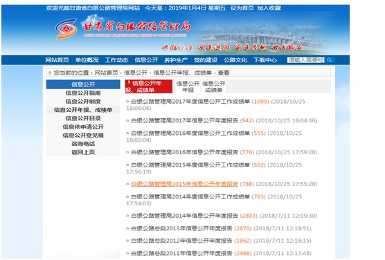 2018 年,白银公路管理局在白银市委、市政府和省交通运输厅、省公路局的正确领导下,在市政务公开领导小组办公办室的精心指导下,以习近平新时代中国特色社会主义思想为指导,全面贯彻党的十九大和十九届二中、三中全会精神,紧紧围绕公路养护中心工作及群众关心、社会关注的热点、焦点、难点问题开展政务信息公开工作,进一步完善政务信息公开制度,规范形式,加大政务信息公开力度,不断提升政务信息公开的质量和水平。 (一)加强组织领导。我局高度重视信息公开工作,认真贯彻落实市委、市政府以及省交通运输厅、省公路管理局等相关部门关于加强政务信息公开工作的部署和要求,并将其列入重要议事日程。一是调整充实信息公开工作领导小组。成立了以局长为组长,其他局领导班子成员为副组长,机关各科室负责人为成员的信息公开领导小组。领导小组下设办公室,具体负责组织开展各项信息公开工作。二是构建分工负责的工作机制。根据部门职能将信息公开工作的任务分解细化,明确了具体的工作部门,细化了工作分工,形成了主要领导亲自抓,分管领导具体抓,承办科室抓落实的上下联动工作机制,有效确保信息公开工作落实到位。三是严格审核审批程序,确保公开无误。由各业务科室提供公开内容,经科室负责人、分管领导和主要领导审批签字后,报局办公室统一公开,确保公开内容准确无误。 (二)健全制度体系。为确保信息公开工作依法、有序进行,我局结合工作实际,对照信息公开配套制度,修订完善了《白银公路管理局网站管理办法》《白银公路管理局信息公开指南》《白银公路管理局依申请公开信息不予公开备案制度》《白银公路管理局信息过错责任追究制度》《白银公路管理局信息公开应急处置制度》《白银公路管理局信息依申请公开制度》《白银公路管理局信息主动公开制度》等18 项信息公开工作制度,进一步规范了信息公开工作机制,从制度上保证信息公开工作有章可循、规范开展,促进信息公开工作走上制度化、规范化的轨道。