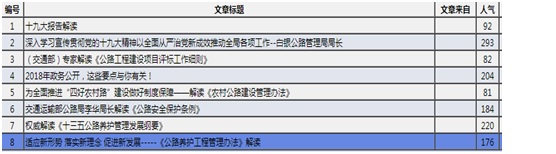 (四)加强政策解读工作。严格按照政府信息公开实施方案的要求,及时升级栏目设施,更新政策法规。在局门户网站信息公开栏目新增“政策解读”,下设“专家解读”“图解解读”“权威解读”“领导解读”四个子栏目,并及时转载发布《“十三五”公路养护管理发展纲要》等与公路行业相关政策解读,解读内容介绍了政策出台背景、重要意义、核心内容和主要措施等,全年累计解读政策7 条,做到“应解读、尽解读”。