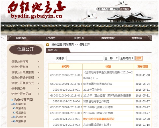 二、主动公开政府信息的情况 (一)主动公开政府信息的数量。截至2018年12月31日,“白银地方志”网站主动公开政府信息共计210条,其中,2018年主动公开政府信息24条。 (二)主动公开政府信息的主要类别。2018年主要公开了机构职能、信息公开年报、政策法规、规划计划、财政预决算、三公经费、政策解读、联系方式等内容。 (三)主动公开政府信息的形式。主要以“白银地方志”网站渠道公开。