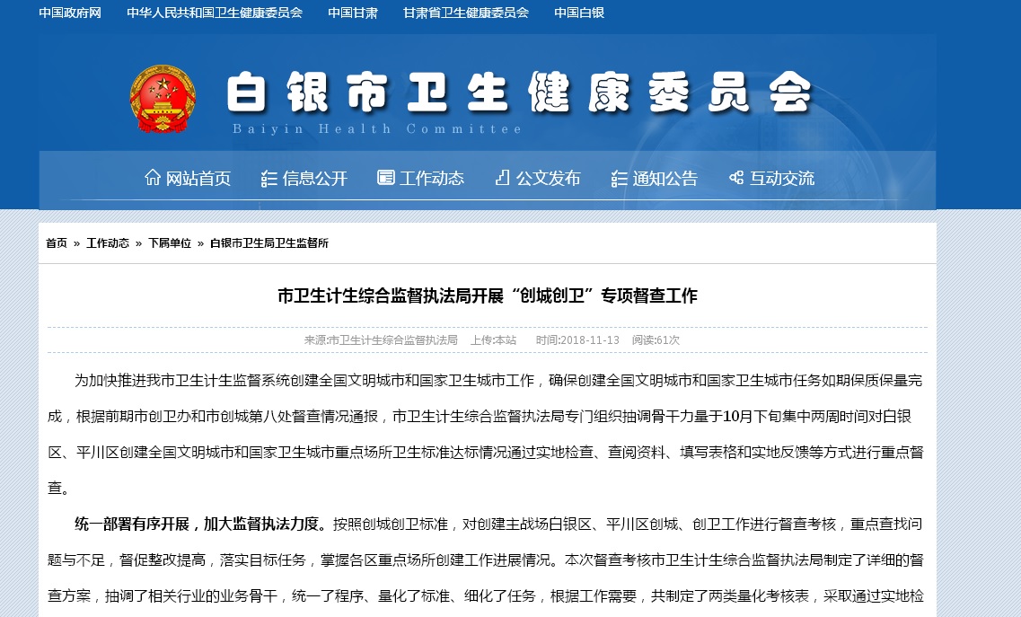 根据《中华人民共和国政府信息公开条例》要求和市政府信息公开工作相关文件精神,市卫生计生综合监督执法局结合本部门政府信息公开工作实际编制本年度报告。年报由概述,主动公开政府信息情况,依申请公开政府信息情况,政府信息公开收费及减免情况,行政复议、诉讼和申诉的情况,存在的主要问题和改进措施等六部分组成。 一、概述 2018年,市卫生计生综合监督执法局在市委、市政府的正确领导下,认真贯彻落实《中华人民共和国政府信息公开条例》、《中共中央办公厅国务院办公厅印发<关于全面推进政务公开工作的意见>的通知》等文件精神,提升政务服务工作能力,依法开展政务公开工作,着力解决卫生计生监督执法工作中群众关注的热点问题,严厉打击违法违规行为,认真履行职责,较好地完成了各项工作任务,为维护我市社会公共卫生秩序和保障人民群众的身体健康作出了积极贡献。 二、主动公开政府信息的情况 (一) 信息公开数量和形式。2018年我局梳理上报由卫计委公开各类政府信息198条,我局通过微信公众号公开信息动态20条。其中通过我局梳理上报由市卫计委通过“中国·白银”公开信息包括历年公开行政权力清单160条,2018年集中式生活饮用水水源监测信息12条;在白银市卫生和计划生育委员会网站公开信息简报26条;通过“白银卫生计生监督”微信公众号推送工作动态20条。(二)信息公开的主要内容。主动公开政府信息主要有计划生育技术服务、公共场所、放射等行政许可,各类卫生行政处罚,卫生行政强制,行政确认等政府权责清单;集中式生活饮用水水源监测信息;全市卫生计生监督工作动态等内容。 在白银政府网站公开职业病行政处罚内容