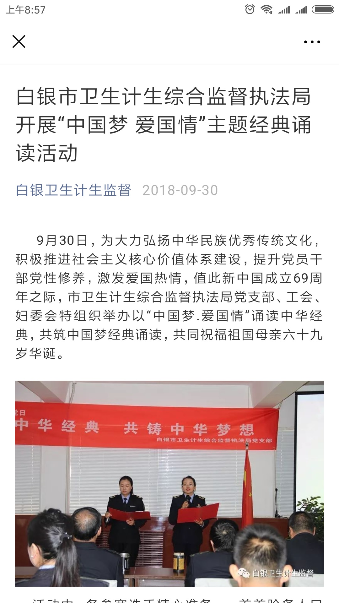 通过“白银卫生计生监督”微信公众号推送工作动态 三、政府信息依申请公开办理情况 2018年,我局未接到有关未接到政府信息依申请公开相关申请工作。 四、政府信息公开的收费及减免情况 2018年,没有发生政府信息公开的收费及减免情况。 五、行政复议、诉讼和申诉的情况。 2018年,我局未接到有关政府信息公开方面的复议、诉讼和申诉。 六、政府信息公开工作存在的主要问题及改进措施。 2018年我局在推进政府公开工作的过程中,取得了一定成效,但是在公开主动性、公开内容、载体建设等方面与上级要求和群众的期望还存在着一定差距,需要进一步加强。下一步,我局在政务公开工作方面进一步抓好以下几方面的工作: 一是加强督查,进一步提高政府公开工作督促检查力度,深入了解群众的呼声和要求,实行有效监督,严格责任追究,确保政府公开办事公开规范、有序、真实、实效。二是加强载体建设,进一步提高政府公开水平。加强对政府服务工作人员的业务培训,提高工作人员的服务水平。整合信息资源,充分发挥互联网和新媒体的作用,为广大公众提供更便捷、更系统、更有效的政府信息公开查询服务,促进公文类信息公开与办事项目公开的有机结合,以政府信息公开带动办事公开,以办事公开带动便民服务。三是扩大宣传,进一步提高政务公开知晓面,通过印发宣传标语等多种形式开展政府信息公开宣传,让广大群众了解卫生监督信息公开的渠道、内容、服务方式,不断扩大政府信息公开的知晓面。 |