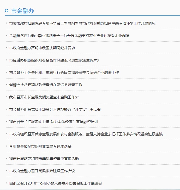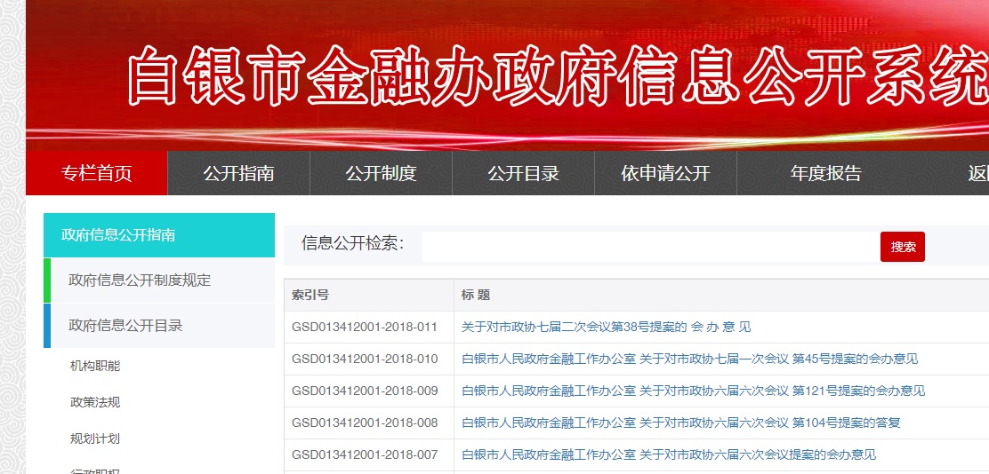 一、概述 根据《中华人民共和国政府信息公开条例》,按照中办、国办《关于全面推进政务公开工作的意见》(中办发〔2016〕8号),省委、省政府办,市委、市政府办《关于全面推进政务公开工作的实施意见》,国、省、市政务公开工作要点等要求,为把政务公开工作落到实处,我办建立了“一把手”为第一责任人,亲自抓政务公开工作,办机关各科室负责人为成员,明确了政府信息公开的职能科室、责任人员和联络员。我办高度重视政务公开工作,将政务公开工作列入年度绩效考核,有力保障了政务公开工作的顺利推进。全面落实政府信息公开工作,现向社会公布2018年度信息公开工作年度报告。本报告中所列数据的统计期限为2018年1月1日起至12月31日。 二、政府信息主动公开情况 (一)公开数量。我办全年主动公开的信息219条,电子化占有率100%。 我办积极拓宽信息发布渠道,在不断丰富和完善白银市金融网网站栏目和内容的同时,积极向白银市政府网站、省政府金融办网站等媒体报送金融信息。 (二)公开类别。我办主动公开的信息主要内容涵盖了机构设置、机构职能、法规公文、政策解读、业务工作等。 (三)公开形式。我办信息公开的形式主要以单位门户网站(白银市金融网,网址:http://www.byjrb.gov.cn)为主 。![]() (四)开展政策解读情况。办党组完善党员干部学习教育机制,坚持每周学习,将学习与业务挂销号制度结合起来,以会代学、逢会必学,重点传达学习党的十九大精神、习近平总书记系列重要讲话精神、中央管党治党的各项决策部署、落实意识形态工作责任制及省市相关文件等,通过学习了解新形势、适应新情况、解决新问题,提高党员干部理论政策水平,确保中央各项决策、部署及时传达到位、入脑入心,统一思想认识。 (五)回应关切情况。在金融信息重点公开领域,我办坚持高质量,严要求,求精准的原则,按照国家、省上及市上要求,积极公开金融相关信息,已基本形成常态化,并且在信息质量上严把关,严格做到能公开必须公开。 (六)建议提案办理结果公开情况 将建议提案办理作为践行党的群众路线和“两学一做”具体实践,高度重视,周密部署,力争做好件件有结果,事事有回音。2018年共办理提案答复函4件。