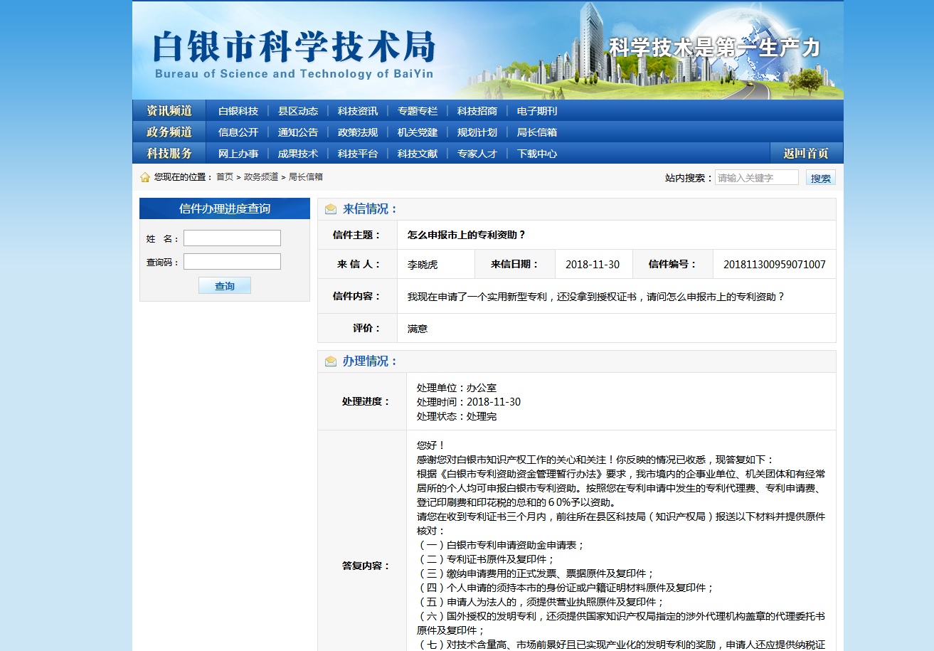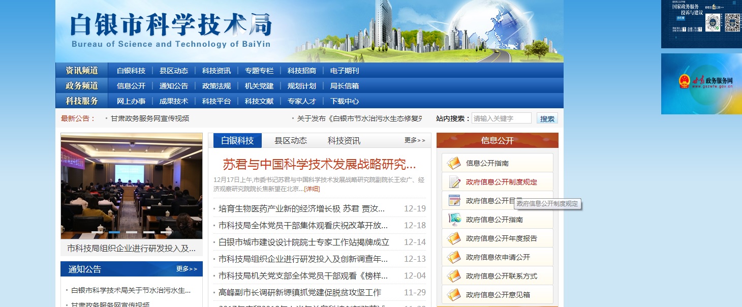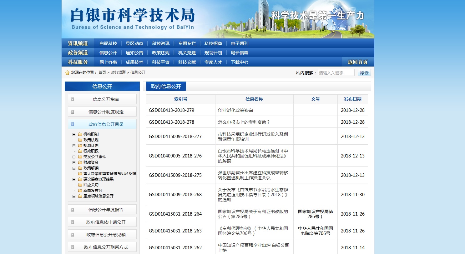 一、概述 (一)加强组织领导,不断健全政务公开服务工作机制。2018调整成果与技术市场管理科(行政审批科)为市科技局政务公开服务工作机构,工作人员1人,政策法规与科技管理科和办公室配合做好政务公开工作,各科室具体负责承办本部门的政务信息公开事宜。局党组多次召开会议,研究部署政务公开工作,并结合市科技局实际,制订了《市科技局2018年政务公开工作要点落实方案》和《2018年度政务公开工作计划》,实行目标责任制,将政务公开工作的各项任务分解到各责任单位,建立了横向到边、纵向到底的责任体系。组织编制了政府信息公开指南、政府信息公开目录和政府信息公开工作年度报告;对拟公开的政府信息进行保密审查;完善了政府信息公开的工作制度和工作规程。 (二)加大学习宣传培训力度,不断提高政务公开工作水平。为提高全局人员人信息公开水平,组织学习了《中华人民共和国政府信息公开条例》、《国务院办公厅关于印发2018年政务公开工作要点的通知》、《白银市关于全面推进政务公开工作的实施意见》、《白银市2018年政务公开工作要点》等相关文件精神,学习了信息公开舆情回应制度、邀请相关方代表列席会议制度、未公开规范性文件意见征集及反馈等信息情况的学习,明确了政务公开的时限和程序,提高了信息公开的水平。 (三)加强门户网站建设,完善信息公开平台。坚持把门户网站作为政府信息公开的第一平台,不断改进提升白银市科技局门户网站性能。按照政府信息公开条例有关规定要求,2018年投入经费10000元对政务公开栏目进行了全面改版升级,建立了信息公开指南、政府信息公开制度规定、政府信息公开目录、政府信息公开指南、政府信息公开年度报告、政府信息依申请公开、政府信息公开意见箱、信息公开联系方式等8个一级类目,政府信息公开目录建立了机构职能、政策法规、规划计划、行政职权、突发公共事件、财政资金、政策解读、重大决策和重要征求意见反馈情况、建议提案办理结果、回应关切、新闻发布会、重点领域信息公开等12个二级类目,专栏建设规范、内容全面,为社会公众获取政府信息提供便利。我局积极建设网站移动客户端、政务微信等媒体平台,围绕群众和企业关注的热点事项以发布公告等形进行宣传。