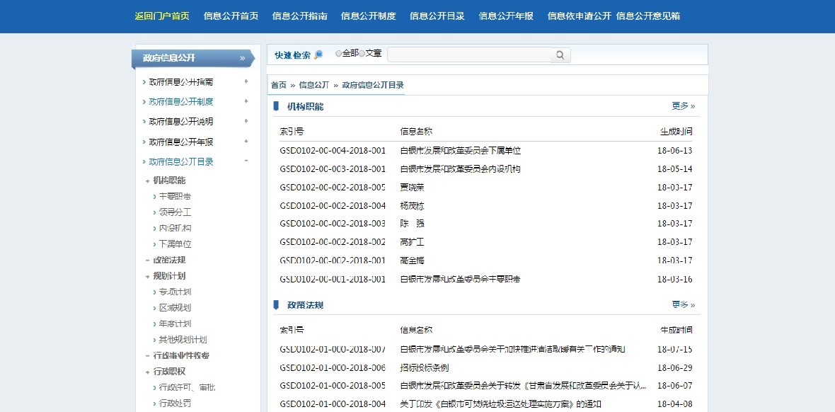 ![]() 2018年,市发展改革委认真贯彻党中央、国务院关于全面推进政务公开工作的系列部署,严格按照《甘肃省2018年政务公开工作要点》和《白银市2018年政务公开工作要点》相关要求,紧紧围绕市委、市政府决策部署,在市政务公开办公室的具体指导下,大力推进决策、执行、管理、服务、结果公开,不断提升政务公开质量和实效。通过加强组织领导,细化工作制度,明确职责分工,加大主动公开力度,狠抓工作落实,政府信息公开工作取得明显成效。一是强化组织领导,及时制定信息公开工作要点。为进一步推进政务公开工作,2018年,我委重新成立了市发改委政务公开工作领导小组,由委党组书记、主任贾晓荣任组长,委副主任杨茂栋任副组长、各科室负责人为成员。领导小组下设办公室,委副主任杨茂栋兼任办公室主任,具体负责政务公开工作及督查、培训和考核事宜。制定下发了《白银市发展和改革委员会关于印发2018年度政务公开工作要点的通知》,明确了工作任务和具体要求,将任务细化到具体科室,确保各政务公开项工作顺利完成。二是拓展公开渠道,加大政府信息公开工作力度和深度。我委把门户网站和微信公众号作为向社会公开信息的主要窗口,加强对委门户网站建设和利用,2018年投入经费15000元,主要用于租赁中国移动集团公司服务器和网站的修改维护工作。紧盯中央政府门户网站、国家发展改革委网站、中国甘肃和每日甘肃网站、市政府门户网站和白银新闻网等重大网站,对上级党委政府重大政策方针、重要条目、重要信息及时在委门户网站转载,努力做到信息同步,确保委门户网站与国家和省市政府在信息公开上保持步调一致。下半年,按照市政府信息公开办要求,对部分栏目进行了调整,积极配合做好国务院办公厅和省政府办公厅信息公开工作督导单位对我委门户网站的普查工作。三是强化工作措施,努力提升政务公开建设质量。制定了《白银市发展和改革委员会网站管理办法(试行)》,按照“谁办理、谁发布、谁负责”的原则,所有发布信息,严格按照“科室初审、分管副主任复审和办公室终审”程序,在网站后台保留台帐,实行源头管理机制。2018年,在门户网站发展改革工作栏目上传81条信息,机关党建栏目上传51条信息,热点专题栏目上传30条信息。委办公室每季度通报各科室在网站信息发布情况,充分调动各科室信息公开的积极性和主动性。建立健全信息公开队伍,明确了各科室在信息公开工作中的职能和责任,每个科室指定一名工作人员担任信息发布联络员。 二、主动公开政府信息的情况