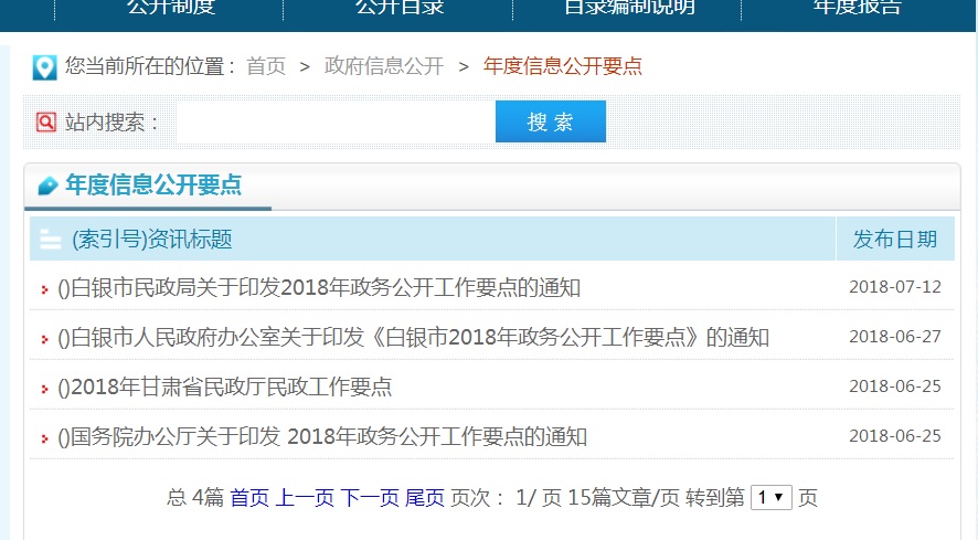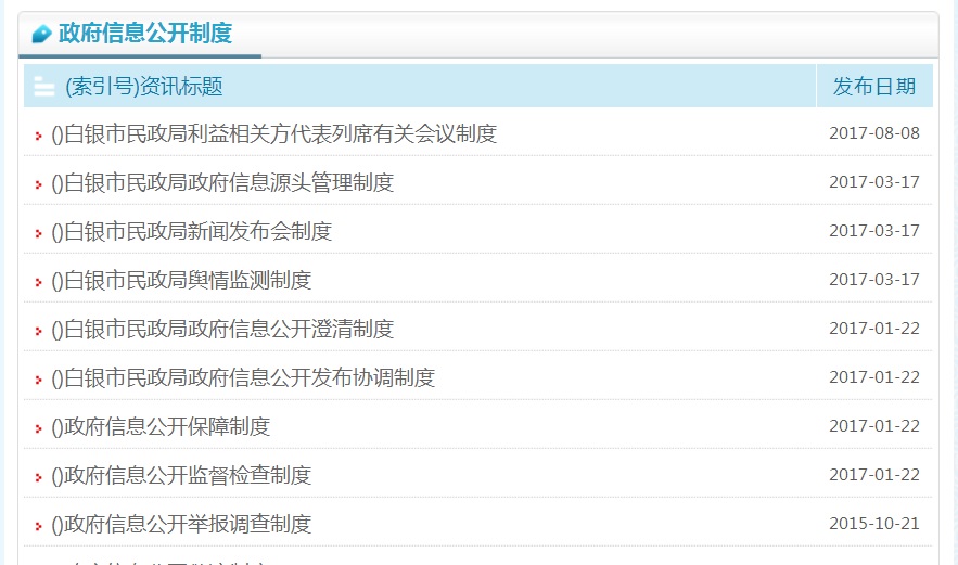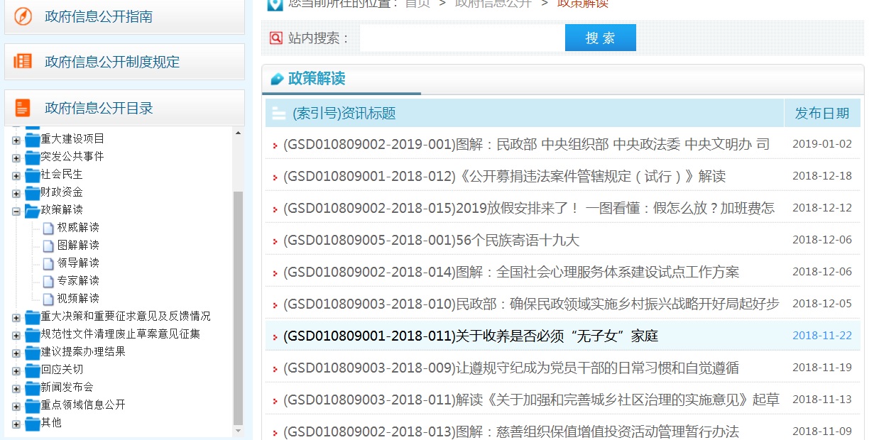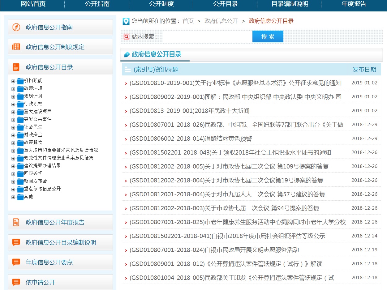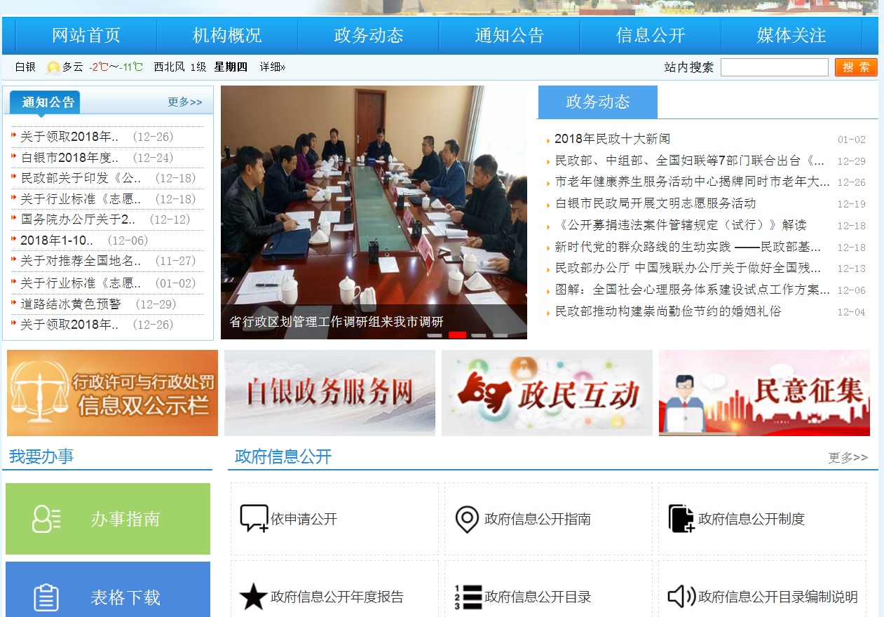 2.加强政务公开制度和平台建设。一是规范网站建设标准。规范我单位门户网站名称,按照政府网站名称要以部门机构名称命名的要求,及时将我局门户网站名称由“甘肃白银民政信息网”改为“白银市民政局”,且在全国政府网站信息报送系统中修改并提交申请,已按照程序报批完成。规范网站域名构成,严格按照《关于做好全省政府网站域名管理工作的通知》要求,再次确认门户网站域名的合理性、有效性、正确性。二是强化政务网站建设管理。加强门户网站建设与管理,充分发挥白银市民政局网站信息公开第一平台的作用,对网站进行了模块化升级,重新规划了网页设置,调整了板块布局,页面功能更加简单实用,强化完善政民互动、民意征集的反馈功能,对原版面内容繁杂,意义微小的板块进行了删除,严格按照目录编制要充分体现“五公开”的要求,对政策解读、舆情回应、回应关切等栏目进行了重新调整,优化了依申请公开页面功能,对机构职能调整了子栏目功能,将领导变化内容进行了补充完善,进一步强化人大代表建议和政协委员提案办理结果公开,对社会广泛关注、关系国计民生的建议和提案,公开答复全文,在白银市民政局网站首页加载“国家政务服务投诉与建议”小程序,展示时间将按照国务院的要求持续加载。完善了网站安全保障机制,做好防攻击、防篡改、防病毒等工作。三是加强政务热线电话管理。按照政务公开办要求对外公开电话管理的有关规定,在网站首页位置主动公开了咨询和联系电话0943-8221548,及时进行电话号码的更新维护和对外发布,按照“首问负责、对口接待、内部流转、高效便民”的原则,保证接通率和处理效率。 二、主动公开政府信息的情况 (一)主动公开政府信息的数量。2018年通过门户网站主动公开政府信息数454条,通过广播电视、报刊、宣传册、微信公众号、今日头条等其他方式公开31条。其中,政策法规类信息数41条,社会民生类信息数74条,优抚安置、区划地名、福利彩票发行、社区建设、社会事务、捐助接受、救灾救济、会议活动、民政要闻、规范性文件等通知公告339条。2008年至2018年通过门户网站主动公开政府信息数累计5900余条。