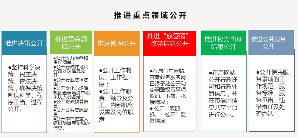 2.推进“放管服”改革信息公开。根据权责事项取消、下放、承接情况进行动态调整,深化权力清单公开工作。通过在市文广新局门户网站、甘肃政务服务网白银子站等集中发布、开设反馈意见信箱、增加在线提交意见建议功能等方式,让公众了解放权情况、监督放权进程、评价放权效果,接受群众监督,推动依法规范履职。围绕年内实现“双随机、一公开”监管全覆盖目标,完善、汇总形成并统一公布本局随机抽查事项清单,明确抽查依据、主体、内容、方式等,及时通过相关平台公开抽查结果和查处情况。