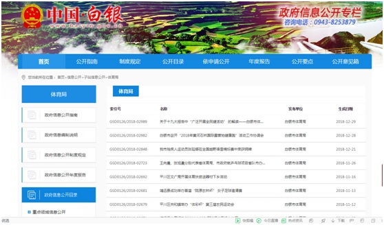 二、主动公开政府信息的情况 (一)主动公开政府信息的数量 截止2018年12月31日,我局主动公开的各项政府信息205条。 (二)主动公开政府信息的主要类别 2018年,我局主动公开政府信息的类别有:信息公开工作制度、体育业务工作(群众体育活动开展、体育运动基础设施建设)、财务收支、人大政协提案办理情况及其他需要主动公开的事项。 (三)主动公开政府信息的形式 为了提高信息公开的效果,方便公众及时了解信息,使政务公开落到实处,我们通过多种有效途径发布政府信息:一是利用市体育局子站主动公开政府信息;二是开展民主评议,设立公开栏等形式进行发布;三是通过印发文件、致公开信(函);四是通过群众来访接待,来信答复,主动传达相关政策信息。同时,坚持推行公开与整章建制并重,健全考核机制与强化监督检查并举,通过建立政务公开领导责任制,强化领导责任,量化工作任务,明确考核奖惩,完善激励和制约机制;通过建立政务公开承诺办理制度,实行首问责任制度和限时办结制,做到有诺必践;通过建立政务监督评议制度,对政务公开工作进行监督和评议;通过建立政务公开责任追究制度,将政务公开纳入党风廉政建设责任制考核内容,强化监督,务求实效。规范行政行为,提高了行政执法水平,保障了政务公开各项制度的有效落实。 (四)开展政策解读工作情况 充分利用市政府体育局子站“政策解读”栏目,认真宣传国家重大政策法规和体育政策法规,先后解读了“全民健身条例”、《全民健身实施计划》等政策文件24篇,积极发挥网站作用解读政策法规的优势。 (五)回应舆情关切情况 2018年,我局未收到社会各界涉及体育工作的询函和回应要求。 (六)落实国家省市政务公开工作安排部署情况 2018年,市体育局认真组织、精心准备公开内容,创新公开形式,完善公开制度,及时利用多种渠道发布和更新可以公开的政府信息,积极、有序、稳妥推进政府信息公开的各项工作。对政府信息公开指南和公开目录进行了完善,对一年以来的政府信息,特别是涉及人民群众切身利益的政府信息,凡属应当公开的事项全部纳入公开目录,并按规定在市政府体育局子站公布。建立健全了相应工作机制和制度规范,保证政府信息公开工作的有序实施。进一步明确信息公开的工作职责、程序、公开方式和时限等要求,完善相关配套措施,保证相关政务信息能及时在政府网站公布。指定专人负责信息公开网站建设、维护和信息内容的更新。 进一步加强对《条例》学习、宣传、贯彻。为进一步强化政府信息公开意识,扎实做好政府信息公开工作,市体育局加强对《条例》的学习宣传工作,努力营造政府信息公开的良好氛围。编制完善了《白银市体育局政府信息公开目录》和《白银市体育局政府信息公开指南》,并在市政府体育局子站公开。 三、政府信息依申请公开办理情况 在市政府体育局子站设置依申请公开专栏,畅通公开渠道,确保在接到依申请公开申请15个工作日内给予答复。2018年,我局未收到任何组织和个人依申请公开事项。 四、政府信息公开的收费及减免情况 2018年,白银市体育中心体育设施公益性服务收费标准参照《市发改收费[2015]782号》执行。