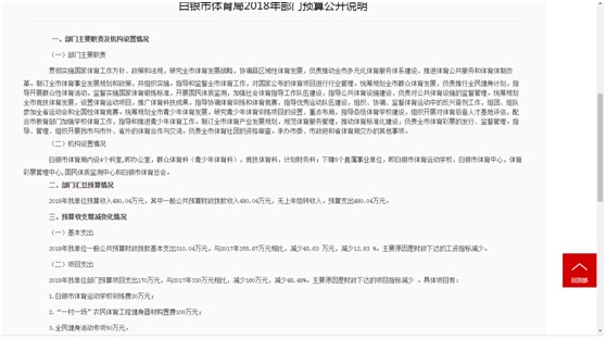 (一)重点领域信息公开情况 我局立足实际,将权责清单在市体育局门户网站向社会公开,对14项审批事项及重大事项工作流程进行了精简再造,明确规定了办理程序和办理时限,工作要求和标准明显提高,干部职工效率意识和服务意识明显增强。在此基础上,我们切实落实限时办结制度。加大基层体育基础设施建设和器材配置等事宜向社会公开力度,对2015年以来,我市实施的体育惠民工程项目建设情况和器材配置情况上传市体育局网站向社会公开,保障了权力运行的公开透明。全面公开年度财务决算和体育彩票公益金使用情况,接受社会监督。 (二)行政权力运行情况 1.严格依据法律、法规、“三定”方案以及本单位工作实际情况,完成了行政许可审批事项和非行政许可审批事项的细化规范工作,并对3项审批项目和1项其他行政权力事项规范细化内容在政务服务网、市体育局网站、政务大厅窗口进行公开。将行政审批时限从法定的20个工作日压缩至15个工作日(承诺时限)。 2.加强对取消和调整的审批事项的监管,对已取消和调整的审批事项进行监管,确保这些事项不再实施审批,杜绝违法违规设立审批事项和变相审批,确保各项审批事项真实、合法。 3.推行阳光政务,所有审批事项在网上公开,设立举报电话,杜绝在办理行政审批事项的过程中出现吃拿卡要等现象。 (三)财政预决算情况 1.部门收支概况 (1)收入预算:2018年收入预算为480.04元,一般公共预算财政拨款收入480.04万元,无上年结转收入。。 (2)支出预算:2018年支出预算为480.04万元,全部为文化体育与传媒支出。 2.公共财政拨款支出预算 (1)基本支出:2018年年初预算数为310.04 万元,是指为保障市体育局机关、直属事业单位等机构正常运转、完成日常工作任务而发生的各项支出,包括用于基本工资、津贴补贴等人员经费以及办公费、电费、邮电费、差旅费等日常公用经费。