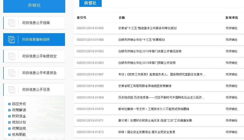 二、主动公开政府信息情况 在主动公开信息工作中,我社做到了应当公开的一定公开、可以公开尽量公开,以方便公众了解信息。同时为确保信息的时效性,我社尽可能做到及时发布,2018年度在白银市门户网站系统共公开政府信息数30条,其中回应关切类信息2条、政策解读类信息14条、财政资金类信息2条、规划计划类信息2条、法规类信息8条、机构职能类信息2条。 三、依申请公开政务信息情况 2018年度本部门收到依申请公开0件。 四、政府信息公开的收费及减免情况 未因政府信息公开向公民、法人和其他组织收费。 五、因政府信息公开申请行政复议、提起行政诉讼情况 无针对本部门的有关政府信息公开事务的行政复议案、行政诉讼案。 六、政府信息公开工作存在的主要问题及改进措施 2018年我社在政务公开工作上虽然取得了一定的成效,但是通过自查我们也发现了一些不足之处,主要表现在以下几个方面: 1、政府信息公开的社会认知度不够高,相关政策宣传解读工作需进一步加强。 2、主动公开政府信息内容的质量与效益与公众的需求还存在一些差距,公开形式便民性需要进一步提高。 3、政府信息公开工作的规范化、科学化水平有待进一步提高。 相应的改进措施如下: 1、加强对干部职工的培训,使各科室工作人员认识到政务信息公开对促进日常工作开展的重要性,形成政务信息公开的常态化、制度化、长效化。同时将进一步加强一把手政策解读机制。 2、针对我社工作内容,对社会公众关注的信息不断进行优化,提高发布信息的质量,提升信息公开的水平。 3、掌握信息公开工作的规律,进一步规范信息公开的程序,强化制度建设,各部门相互衔接管理机制,加强对信息的监管,形成信息公开的长效机制。 |