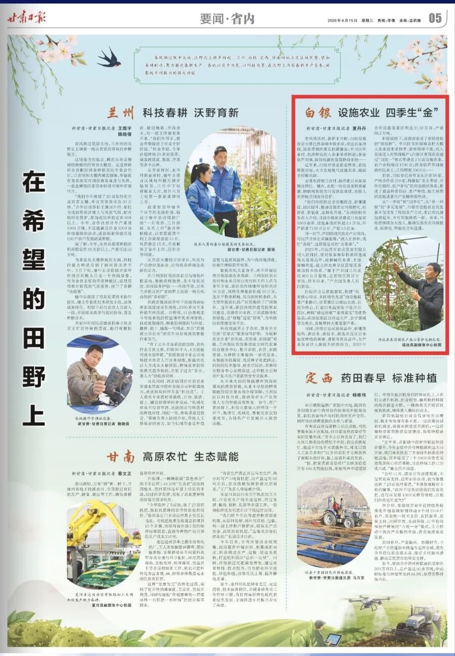 4月15日,《甘肃日报》报道,白银市锚定农业增效、农民增收目标,大力发展现代设施农业,铺就乡村振兴路。