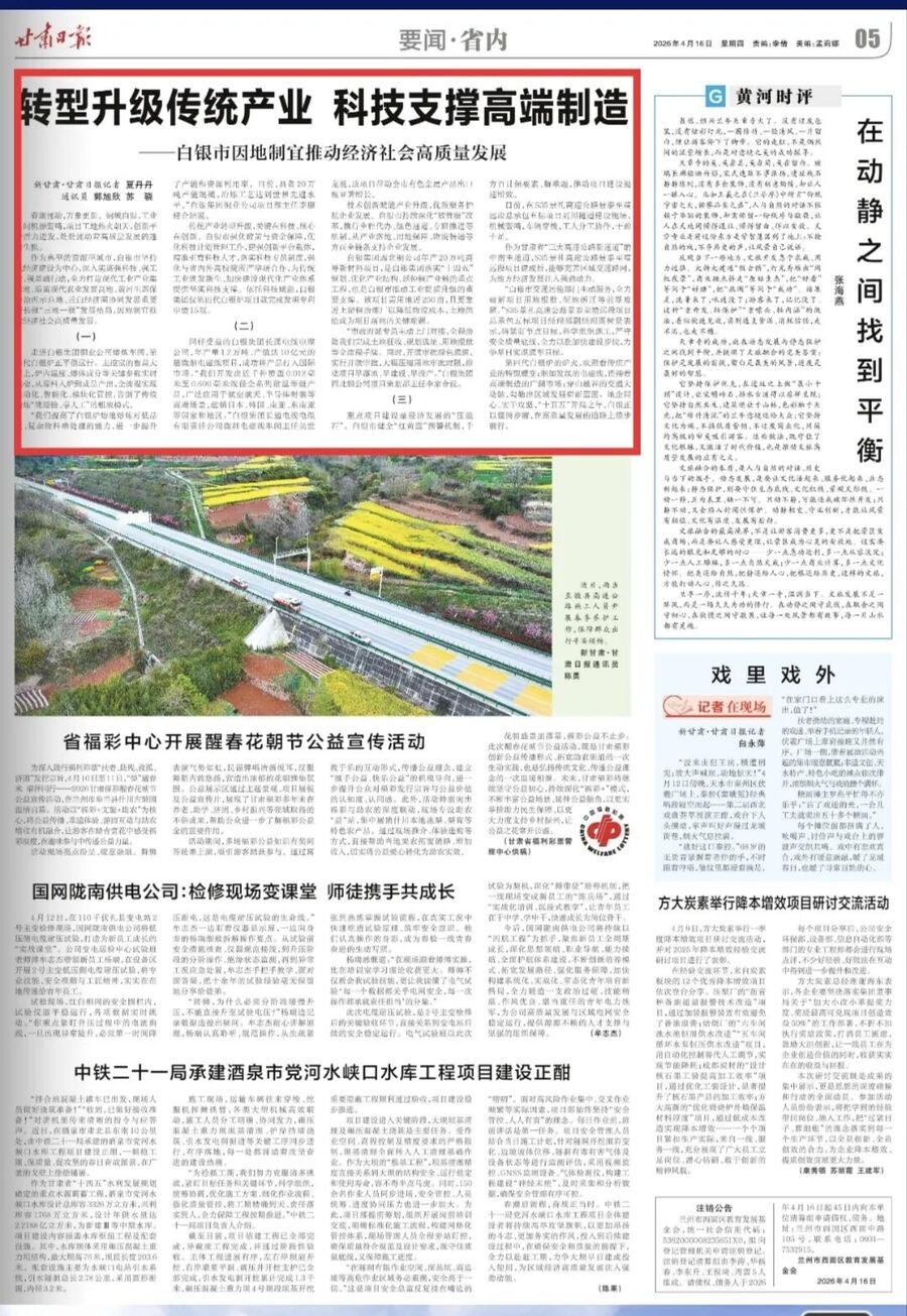4月16日,《甘肃日报》报道,白银市坚持以经济建设为中心,深入实施强科技、强工业、强基础行动,全力打造“三地一极”发展格局,因地制宜推动经济社会高质量发展。