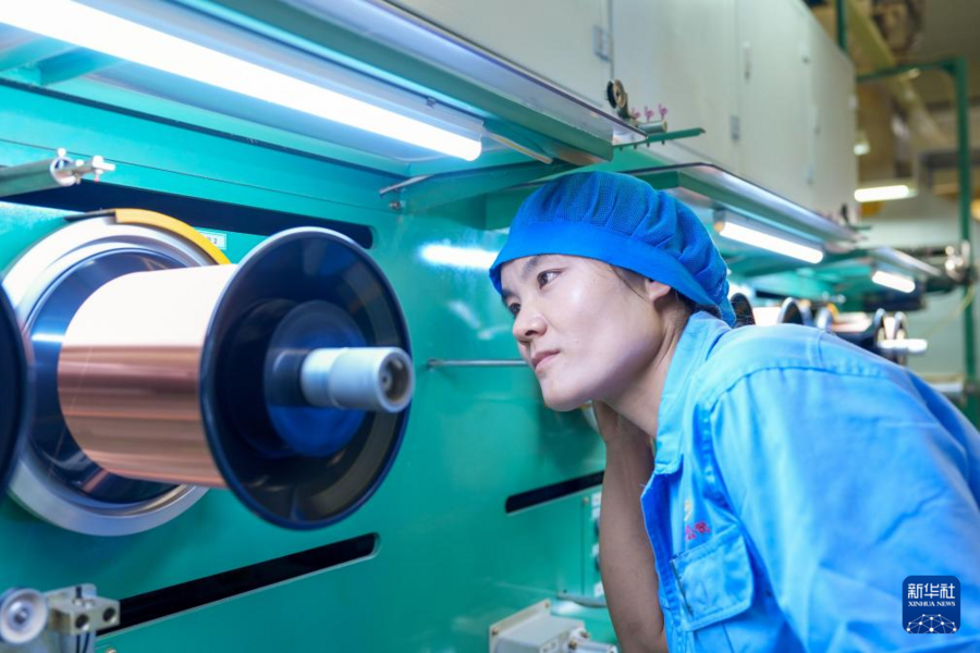 4月12日,在白银有色长通电线电缆有限责任公司微细电磁线车间,工作人员观察成品排线作业情况。新华社记者 郎兵兵 摄