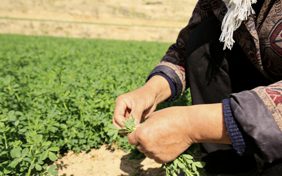 苜蓿在会宁有着悠久的采食历史,这里干旱少雨、光照充足,黄土层深厚肥沃,孕育出的紫花苜蓿叶片肥厚、汁水饱满、清香回甘,既是耐旱耐寒的优质牧草,也是乡亲们珍视的天然野菜。每年三月上旬,头茬苜蓿最为鲜嫩,是一年中口感最佳的时节。清晨的田埂边、沟渠旁,随处可见挎着竹篮、弯腰掐苜蓿的村民,指尖轻捻,只取最顶端的嫩尖,不一会儿便装满一篮青翠,满载着春日的馈赠。