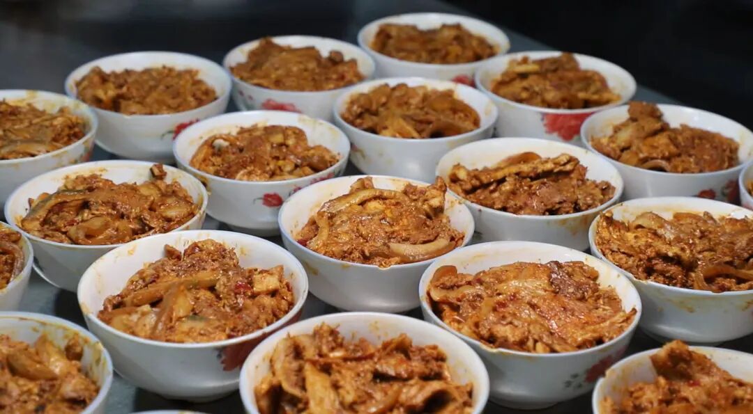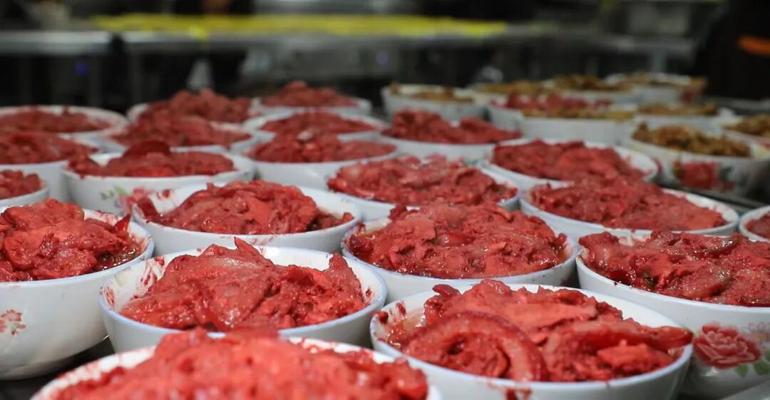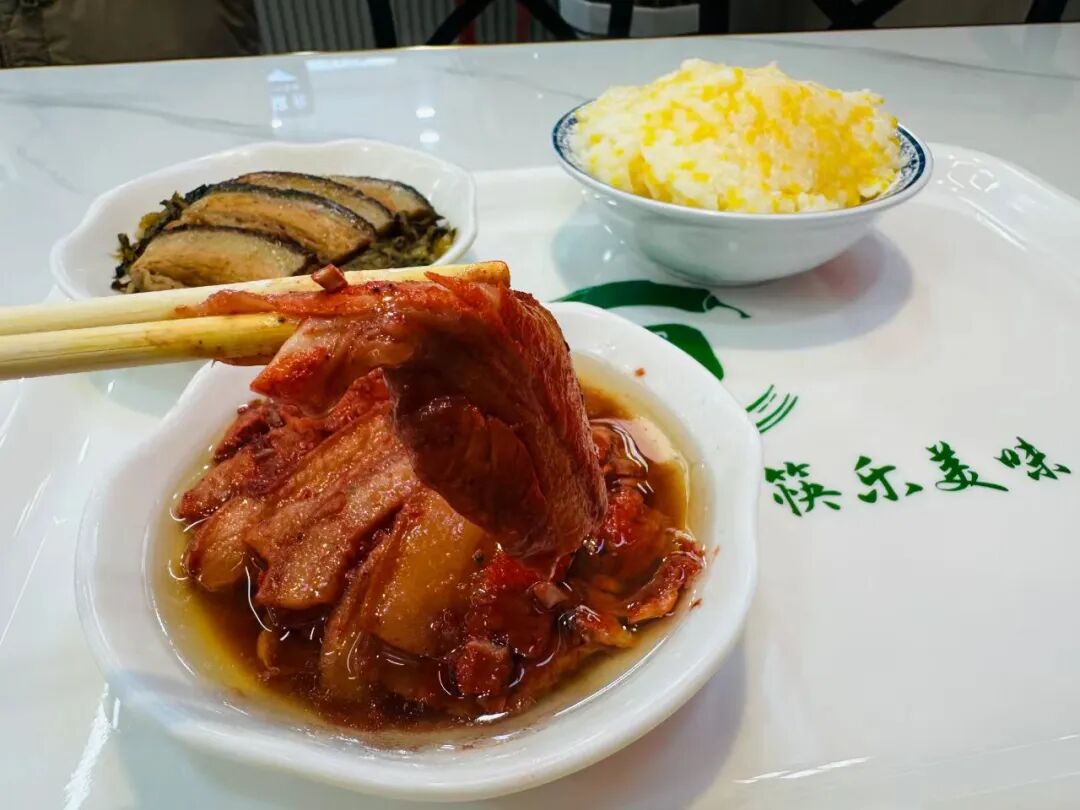 如果说炸货是年味的序曲,那蒸碗便是年味的高潮。糟肉是靖远年夜饭桌上的“压轴大戏”。五花肉切薄片,抹上红曲腐乳,肉皮朝下码入碗中,上笼大火蒸透。出锅倒扣,红亮油润,夹入荷叶饼,肥而不腻、入口即化。这一口软糯,是靖远人对“肥年”最朴素的期盼。无论是千刀酥的“千锤百炼”,还是糟肉的“岁月醇香”,亦或是香水梨的“甘甜如饴”,都是靖远这片土地给归乡人最深情的犒劳。